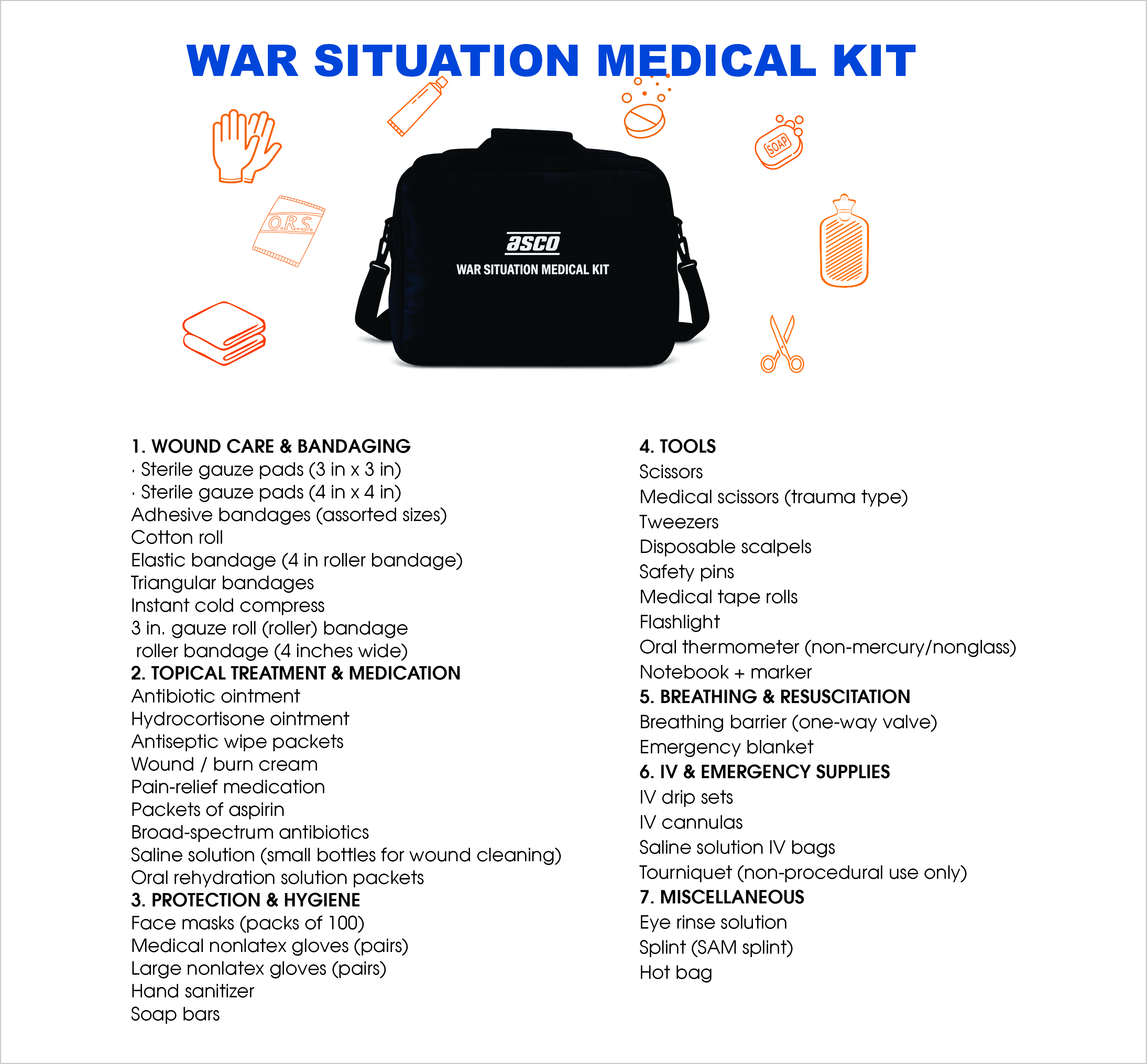 Designed to support front line medical response in conflict and war zones by providing essential supplies for trauma care and emergency treatment.